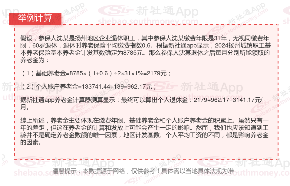 假设扬州网友朱某的工资总额为4494元,那么朱某的缴费基数就是4494元的60%到300%之间。如果他选择按照缴费基数为4494,据新社通app养老保险计算器测算显示,朱某个人缴费额就是4494元*20%,等于898.8元。