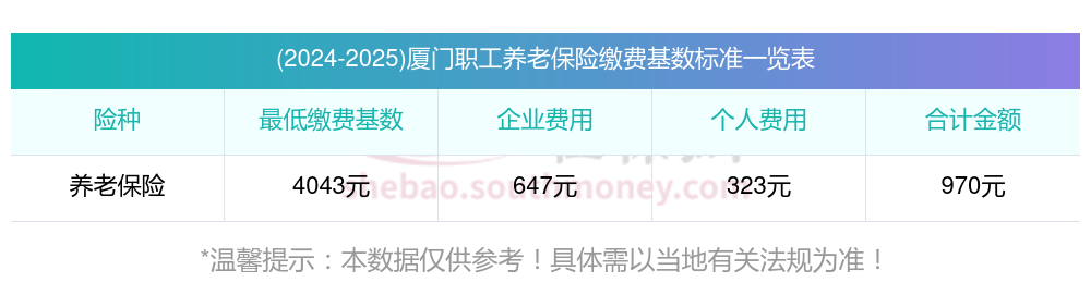 2024-2025年养老保险一年交多少钱+缴费价格表2024-2025年厦门养老保险缴费基数最新标准