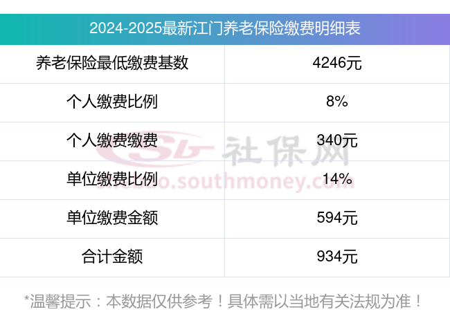 江门养老保险最低缴费基数:4246元;
