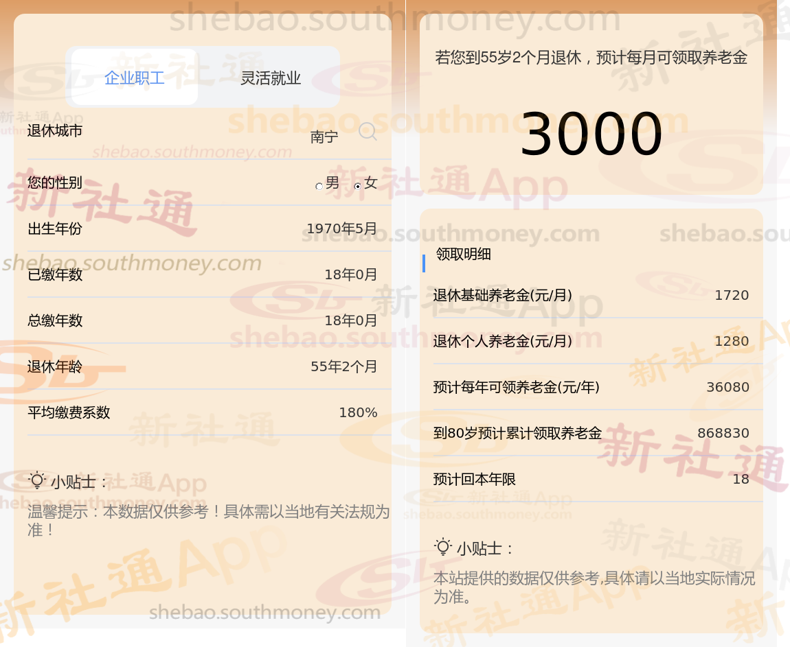 柯某,拥有长达18年的养老保险缴纳年限,其缴费档次一直维持在较高的180%水平。基于这些详细信息,我们使用了新社通app养老金计算器,并参考了当前的养老保险法规,对他未来的养老金进行了如下估算:
