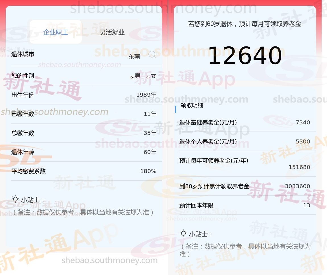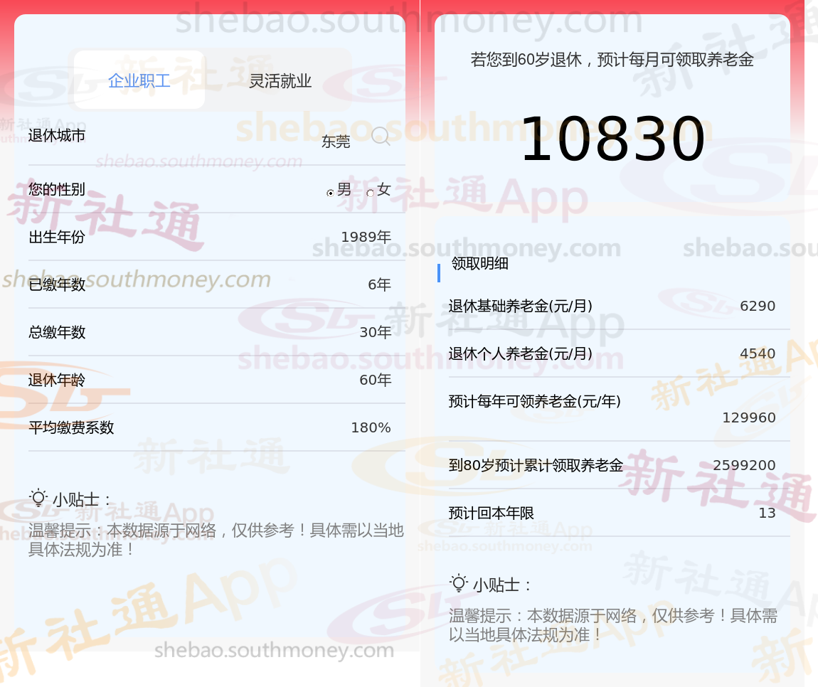 通过新社通APP-养老金计算所得:退休城市、出生年份、退休年龄、缴费系数都相同的情况下,社保缴费年限累计30年时,计算如下: