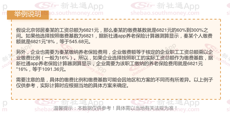 据新社通app显示,北京企业职工养老保险的缴费基数为:6821元。