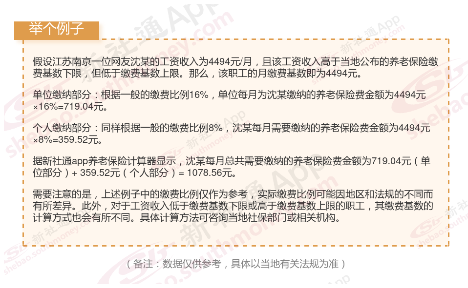缴费基数下限暂按不低于4494元/月执行。按照单位16%+个人8%的缴费费率,单位和个人养老保险缴费金额分别不低于719.04元/月、不低于359.52元/月。