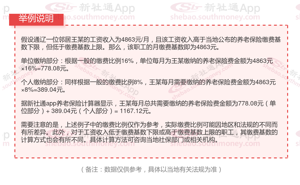 据新社通app养老保险计算器显示,通辽职工基本养老保险缴费金额=个人养老保险缴费金额+单位养老保险缴费金额=389.04元+778.08元=1167.12元