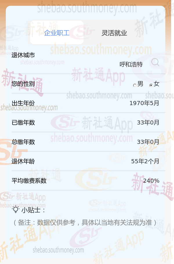 笔友张某退休城市在内蒙古呼和浩特,性别:女,出生年份:1970,总缴年数33年,缴费档次:240%