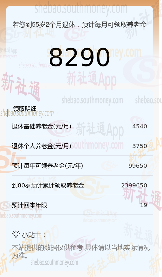 基础养老工资:基本养老金=(全省上年度月平均工资+本人指数化月平均工资)/ 2 × 缴费年限×1%。通过公式计算出每月大约4540元。