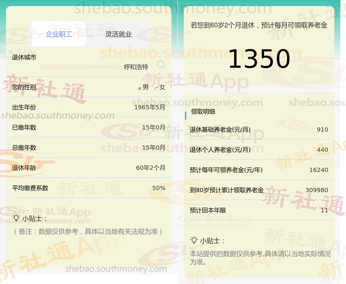 希某,男,1965年出生,现居呼和浩特并已退休。其养老保险缴纳情况如下:总缴费年限为15年,缴费档次达到50%。根据新社通app养老金计算器的估算结果: