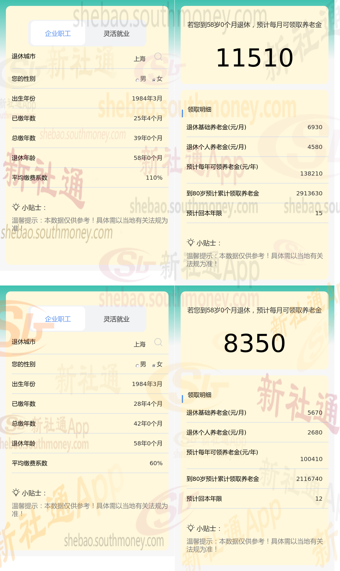 新社通app养老金计算器,轻松测算您的养老金!:两者相差11510-8350=3160元。
