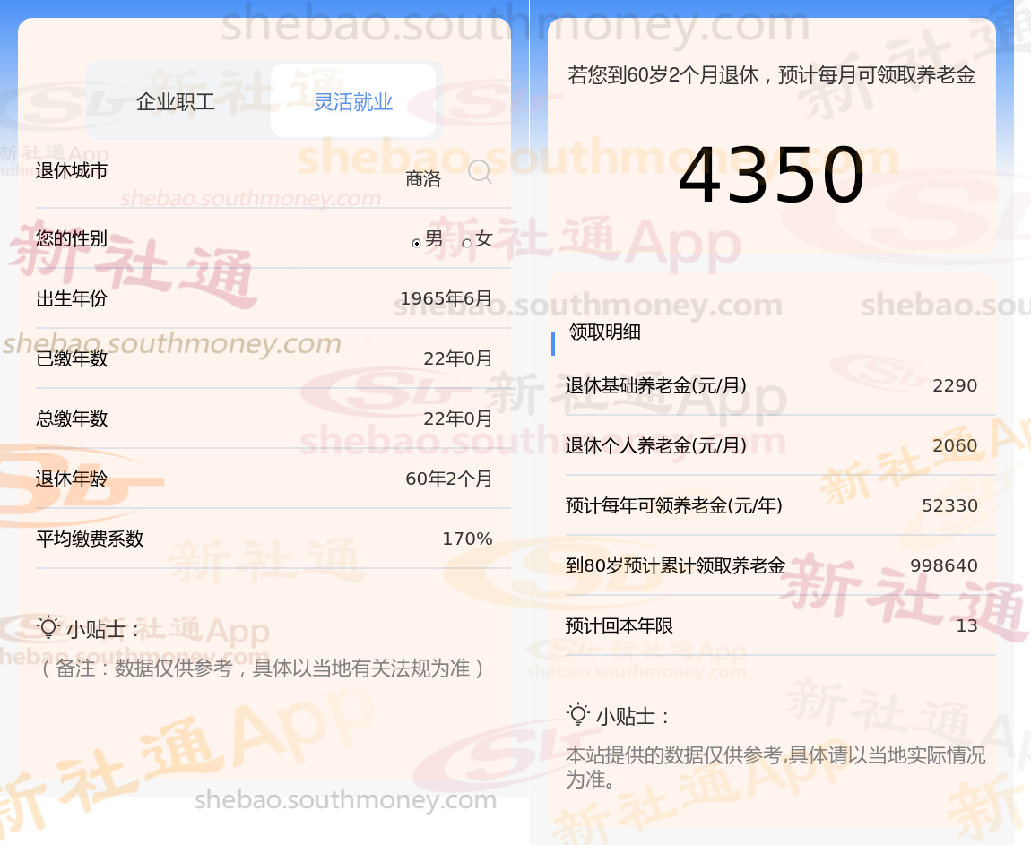 退休城市:商洛,性别:男,出生年份:1965,总缴年数22年,缴费档次:170%,新社通app养老金计算器所得: