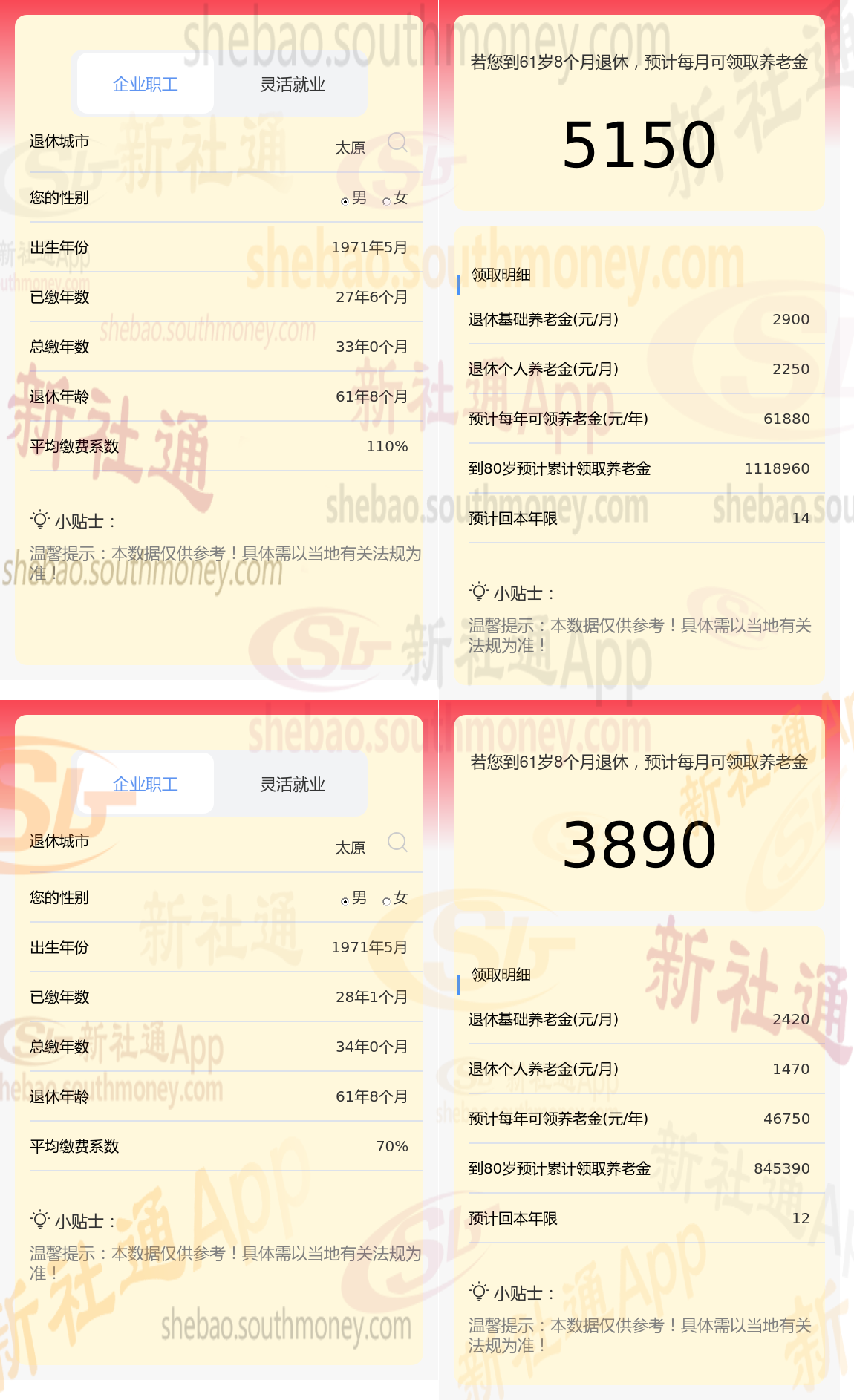 康某:退休城市太原,社保缴费年限33年,61周岁退休,按110%缴费档位。