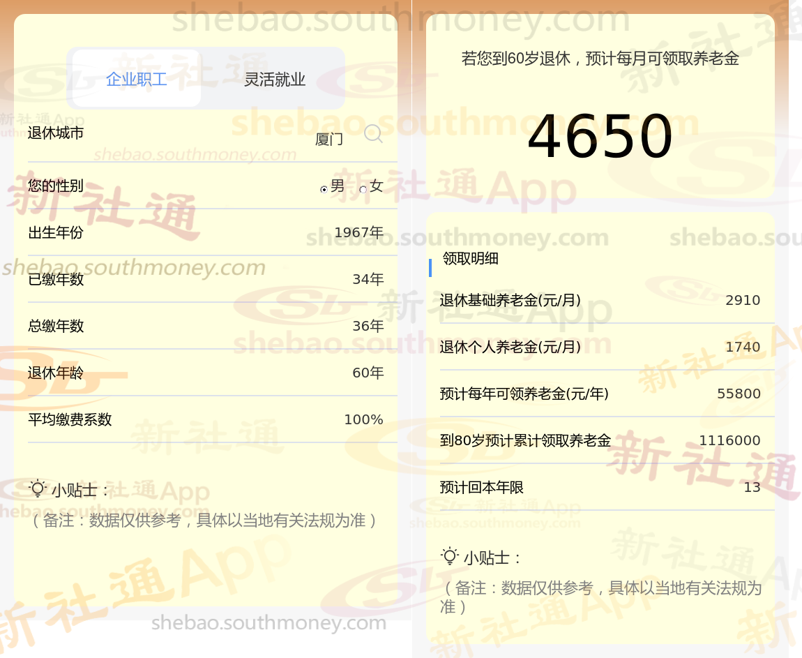 通过新社通APP-养老金计算所得:退休城市、出生年份、退休年龄、缴费系数都相同的情况下,社保缴费年限累计36年时,计算如下: