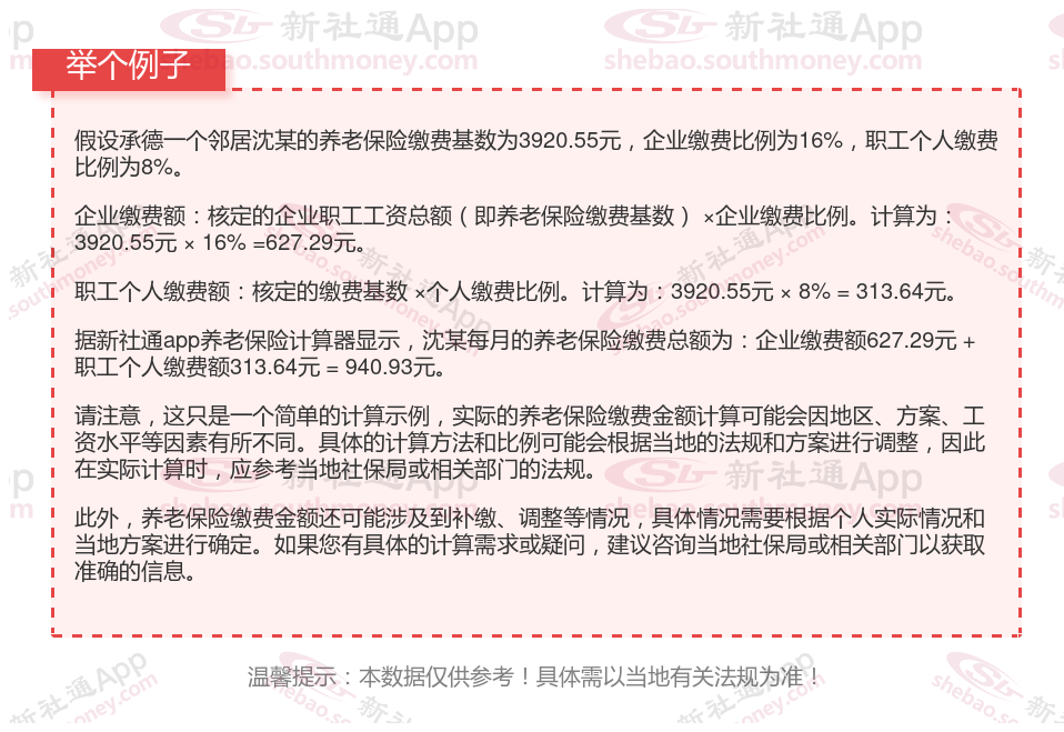 据新社通app养老保险计算器显示,承德职工基本养老保险缴费金额=个人养老保险缴费金额+单位养老保险缴费金额=313.64元+627.29元=940.93元