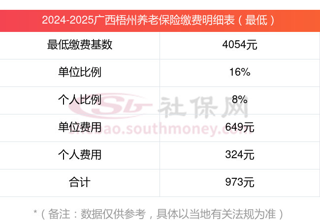 据新社通app显示,广西梧州2024-2025企业职工养老保险的缴费基数为:4053.6元。
