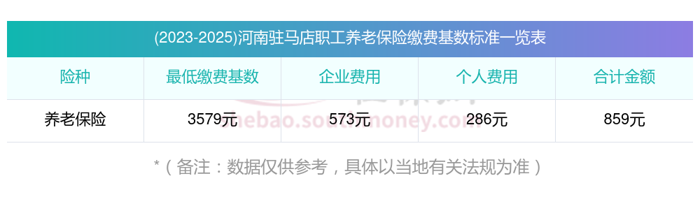 河南驻马店养老保险最低缴费基数:3579元;