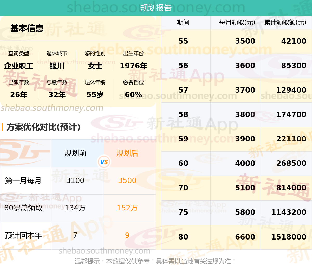 规划前:55岁第一个月约领3100元,新社通APP-养老金规划后:55岁第一个月约领3500元
