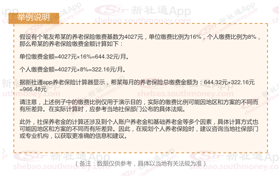 假设湘潭某职工的养老保险缴费基数为4027元,企业缴费比例为16%,职工个人缴费比例为8%。