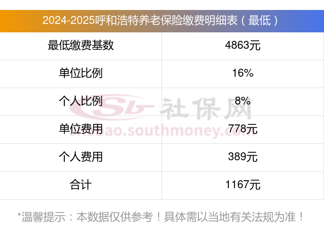 据新社通app显示,呼和浩特职工养老保险最低缴费基数为:4863元;单位和个人的缴费比例分别为:16%、8%;