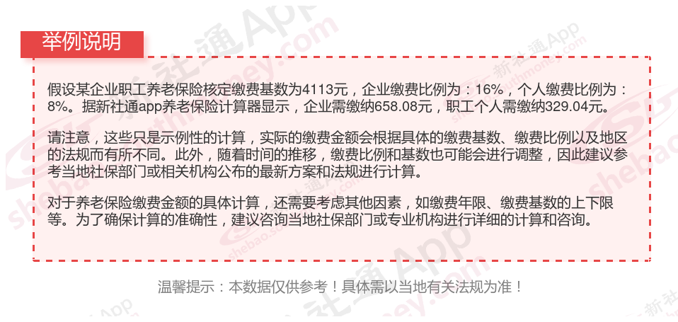 请注意,这只是一个示例计算,实际缴费金额会根据具体的缴费基数和缴费比例而有所不同。此外,养老保险方案也会随时间变化,建议在实际计算时参考最新的方案法规。》点击新社通app养老保险计算器,轻松测算你的养老保险缴纳金额!