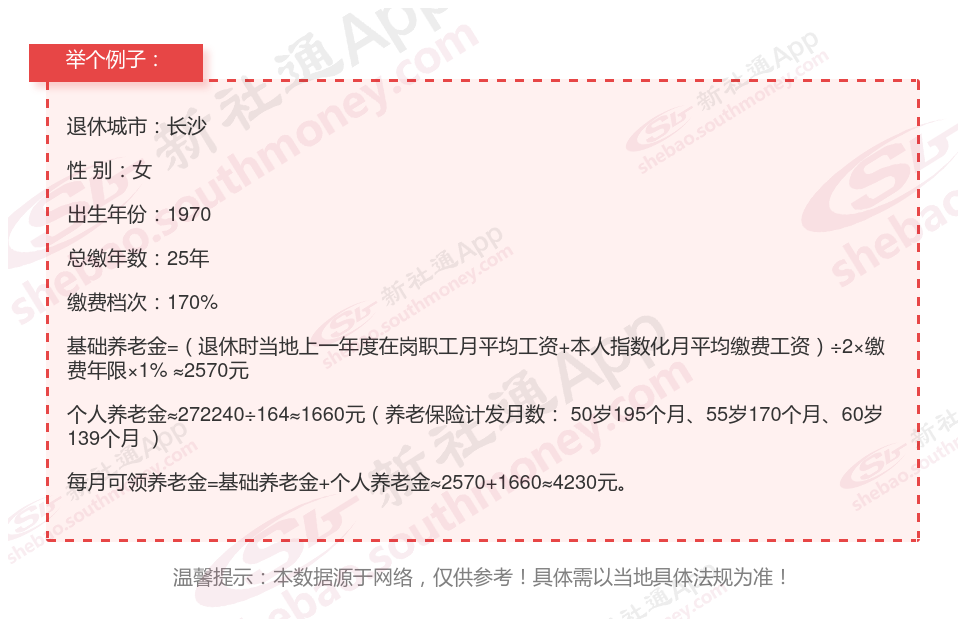 长沙25年基础养老金:基本养老金由统筹养老金和个人账户养老金组成。根据《中华人民共和国社会保险法》第十五条,基本养老金根据个人累计缴费年限、缴费工资、当地职工平均工资、个人账户金额、城镇人口平均预期寿命等因素确定。通过公式计算出每月大约2570元。
