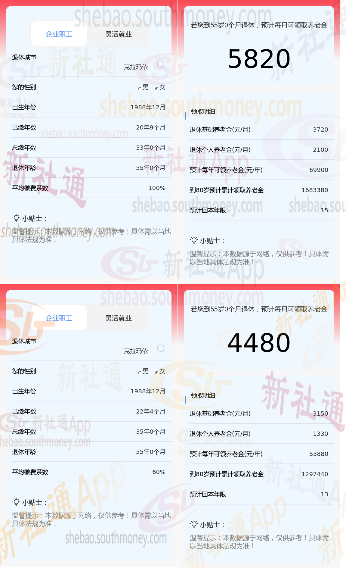 老韩:退休城市克拉玛依,缴费年限35年,退休年龄55周岁,但是按60%缴纳社保。