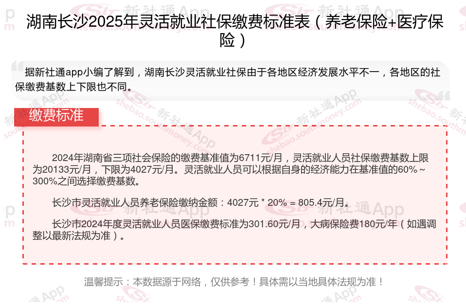 据新社通app数据显示,2024-2025年湖南长沙灵活就业人员养老保险的缴费标准:
