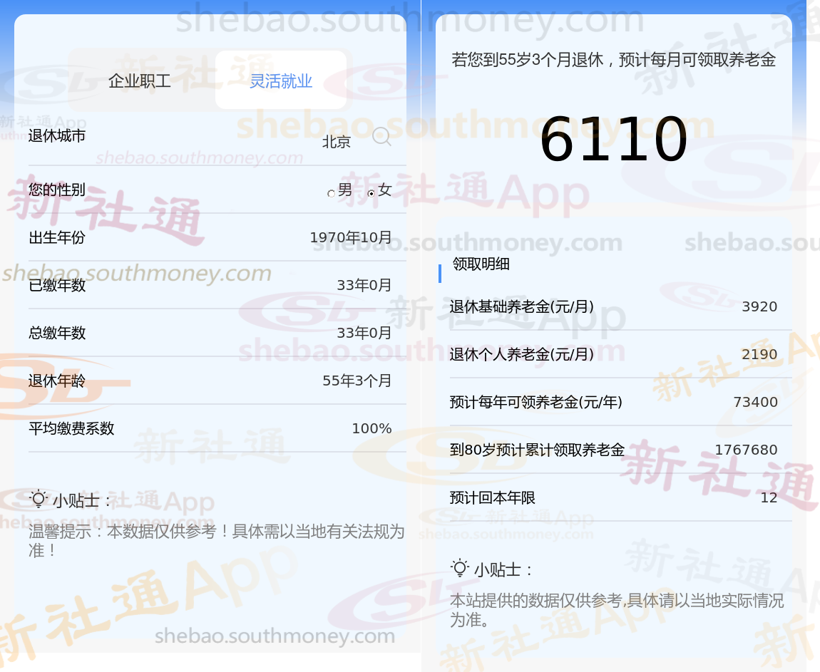 退休城市:北京,性别:女,出生年份:1970,总缴年数33年,缴费档次:100%,新社通app养老金计算器所得: