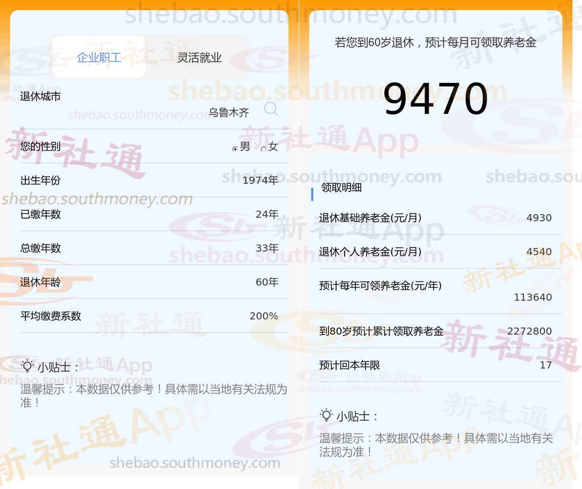 通过新社通APP-养老金计算所得:退休城市、出生年份、退休年龄、缴费系数都相同的情况下,社保缴费年限累计33年时,计算如下: