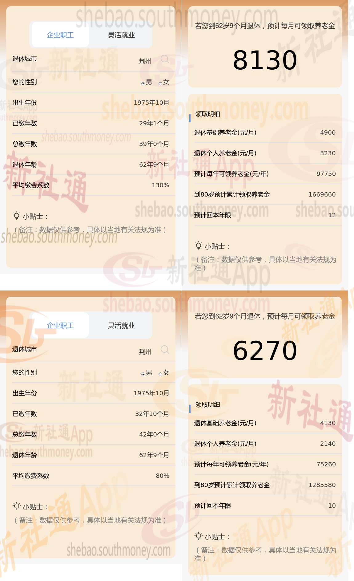 以荆州这座城市作为背景,新社丫丫来对比两位退休人员的养老金情况: 第一位是柯某,他在荆州退休,社保缴费的年限达到了39年,于62周岁时退休,且他一直是按照130%的缴费档位进行缴纳的。 另一位是老赵,同样在荆州退休,但他的缴费年限稍长,为42年,也是在62周岁时退休。不过,与柯某,不同的是吕某是按照80%的比例来缴纳社保的。 (注:此讨论中,新社丫丫暂不考虑过渡养老金。)