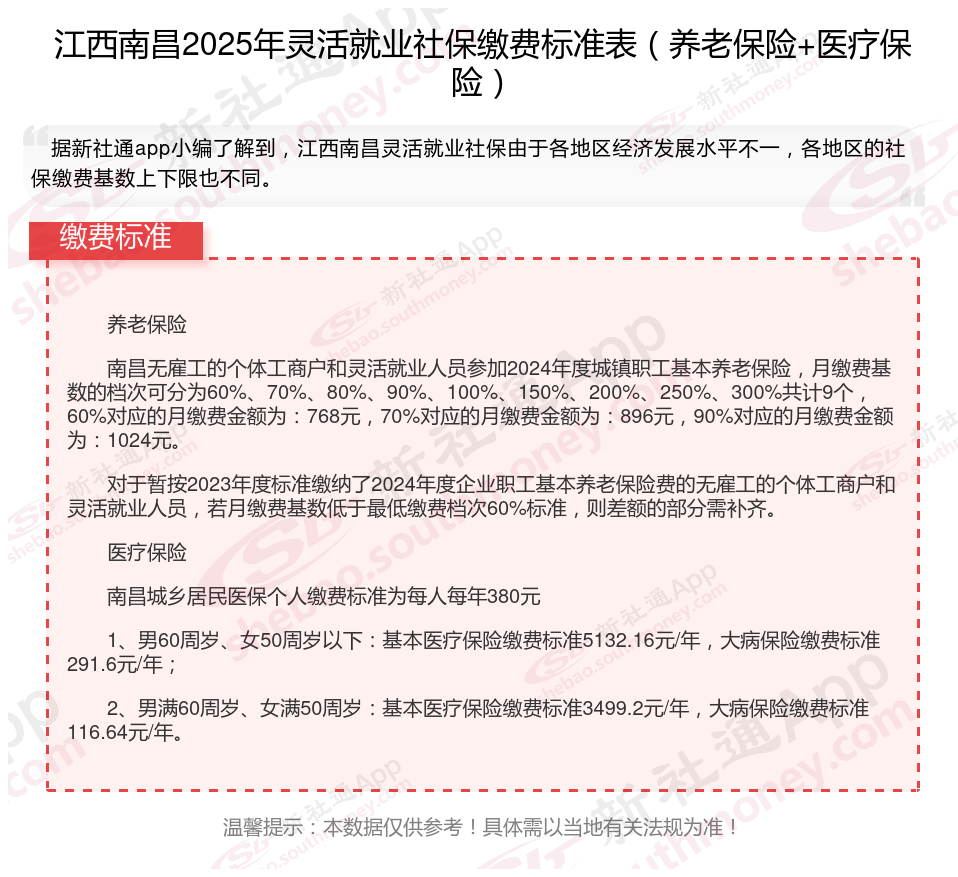 据新社通app数据显示,2024-2025年江西南昌灵活就业人员养老保险的缴费标准: