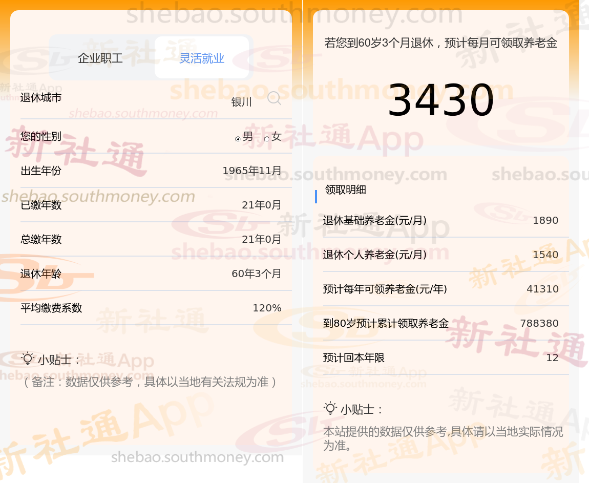 退休城市:银川,性别:男,出生年份:1965,总缴年数21年,缴费档次:120%,新社通app养老金计算器所得: