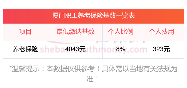 根据有关法规,厦门企业职工基本养老保险缴费基数暂按不低于4043元;