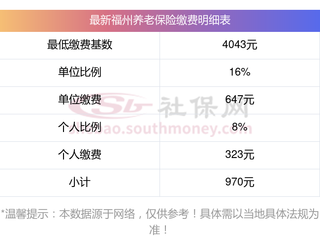 据新社通app显示,福州职工养老保险最低缴费基数为:4043元;单位和个人的缴费比例分别为:16%、8%;