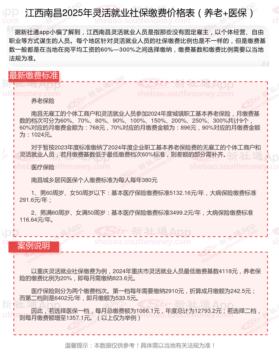 据新社通app数据显示,江西南昌灵活就业养老保险的缴费基数为:3839元。灵活就业人员参保缴费的比例为个人20%。
