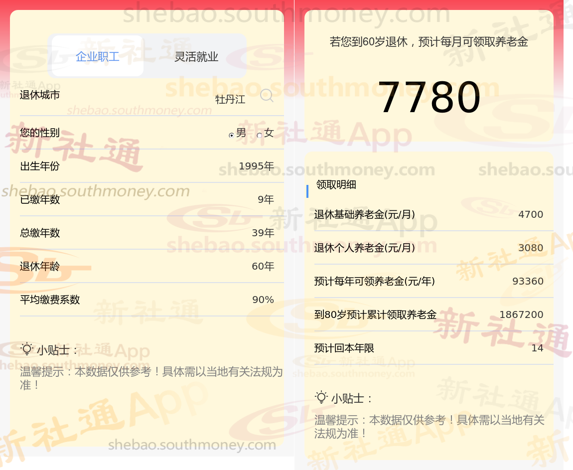 通过新社通APP-养老金计算所得:退休城市、出生年份、退休年龄、缴费系数都相同的情况下,社保缴费年限累计39年时,计算如下: