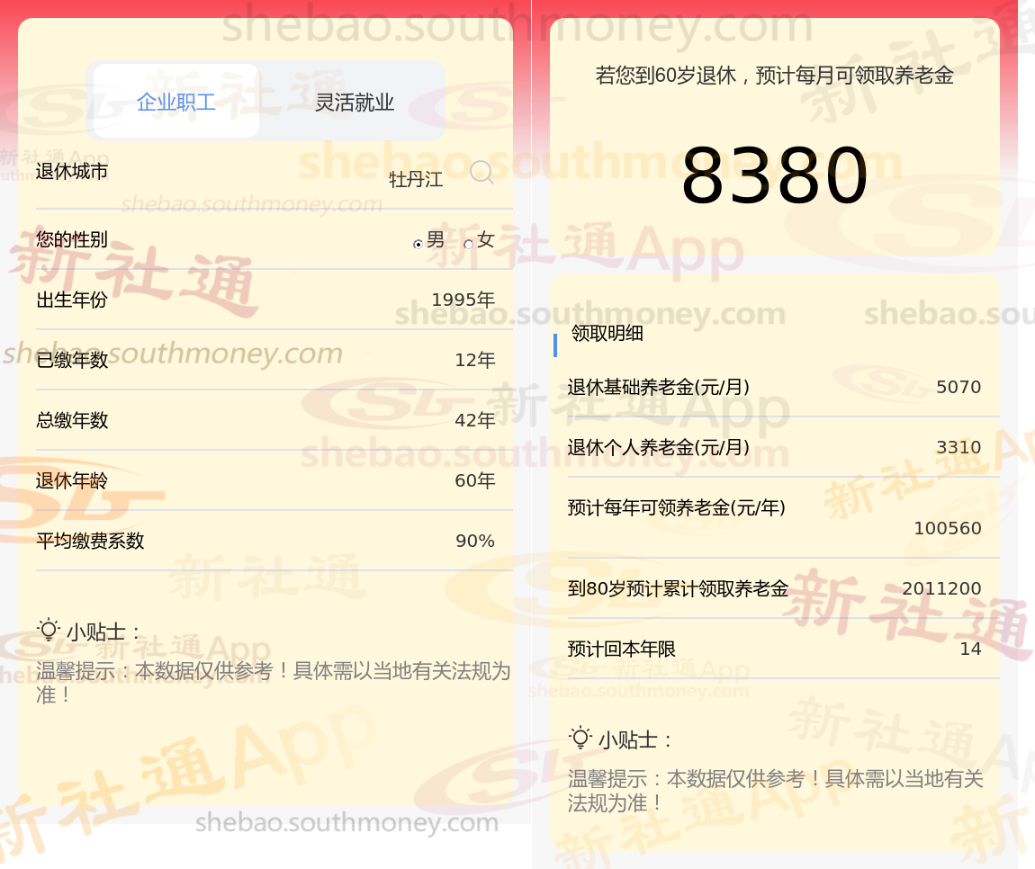 通过新社通APP-养老金计算所得:退休城市、出生年份、退休年龄、缴费系数都相同的情况下,社保缴费年限累计42年时,计算如下: