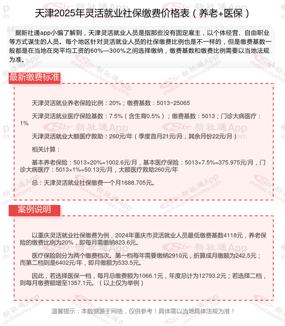 据新社通app数据显示,天津灵活就业养老保险缴费基数2024-2025年最新标准如下: