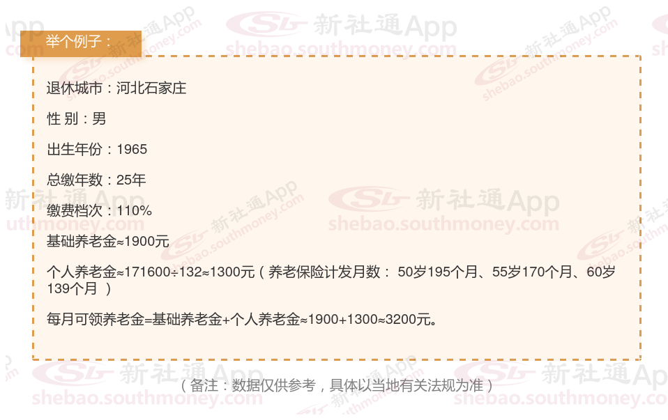 退休城市:河北石家庄,性别:男,出生年份:1965,总缴年数25年,缴费档次:110%,新社通app养老金计算器所得: