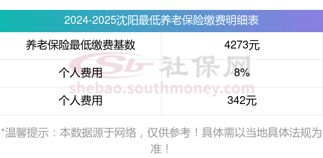 据新社通app显示,沈阳职工养老保险最低缴费基数为:4273元;单位和个人的缴费比例分别为:16%、8%;