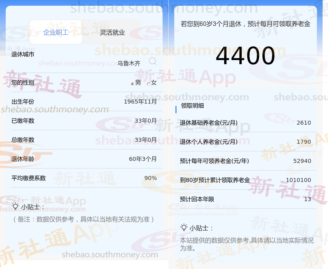 朋友吕某退休城市在乌鲁木齐,性别:男,出生年份:1965,总缴年数33年,缴费档次:90%,新社通app养老金计算器所得: