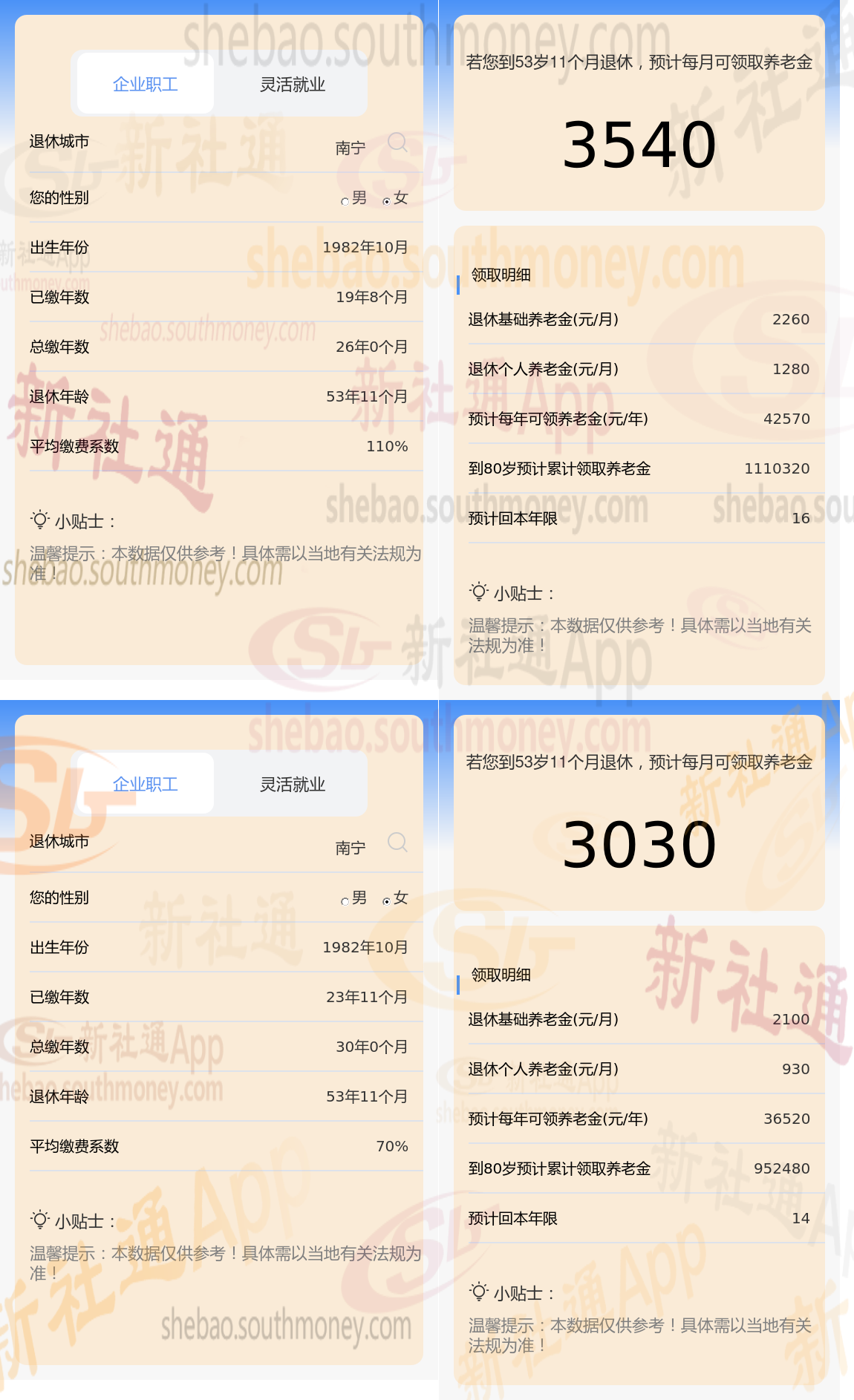 下面新社APP一起来看下,以南宁为例(不考虑过渡养老金):