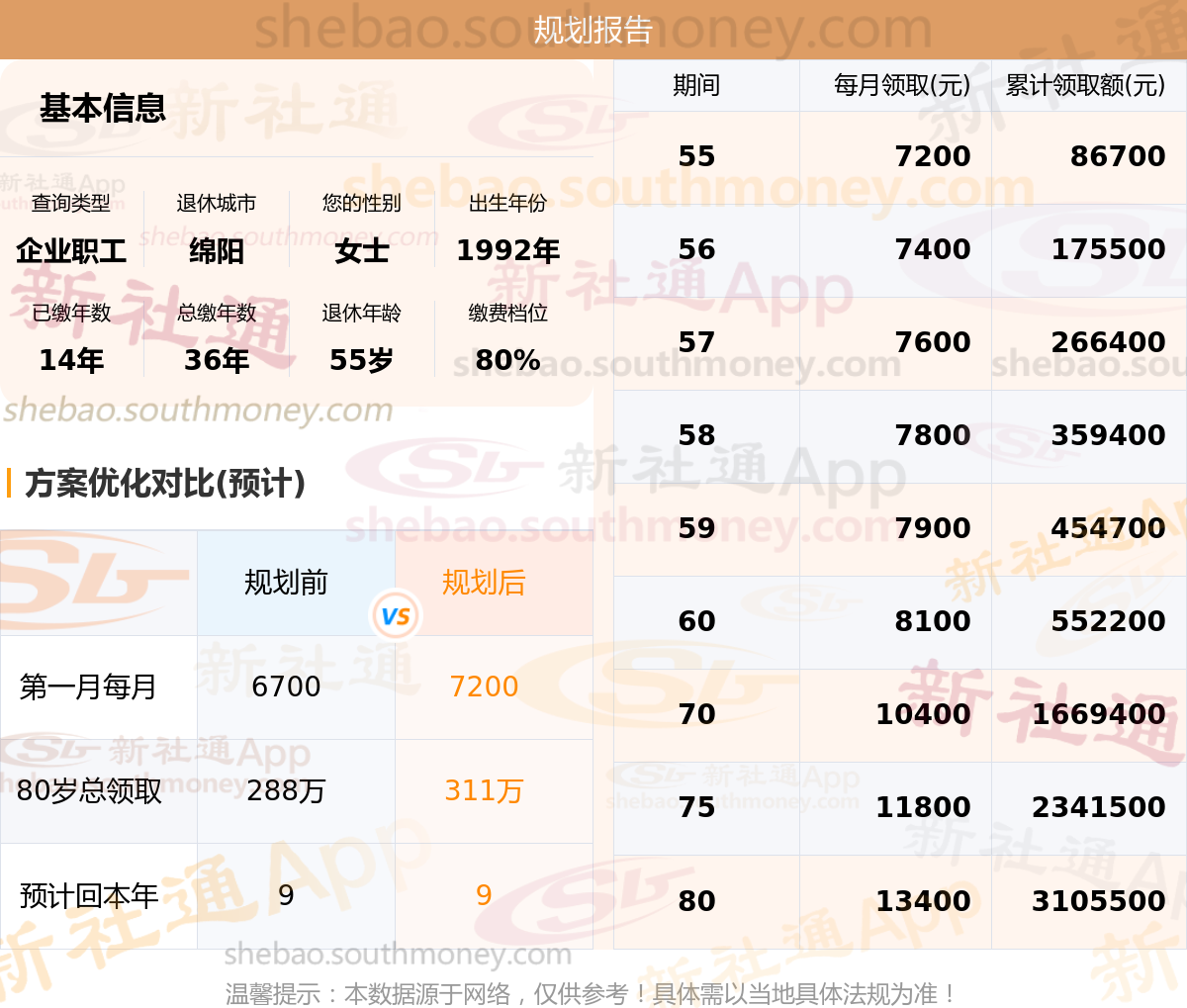 规划前:55岁第一个月约领6700元,新社通APP-养老金规划后:55岁第一个月约领7200元