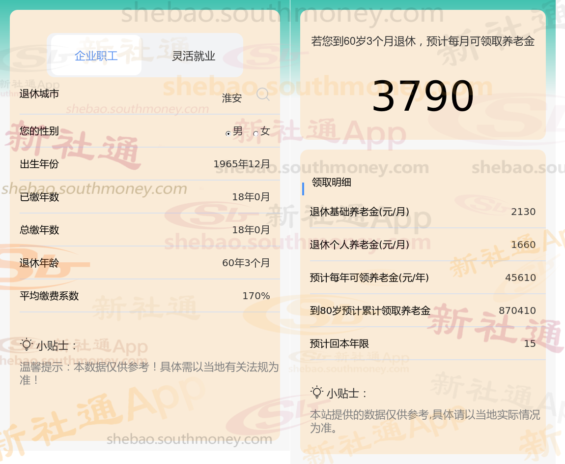 退休城市:江苏淮安,性别:男,出生年份:1965,总缴年数18年,缴费档次:170%,新社通app养老金计算器所得: