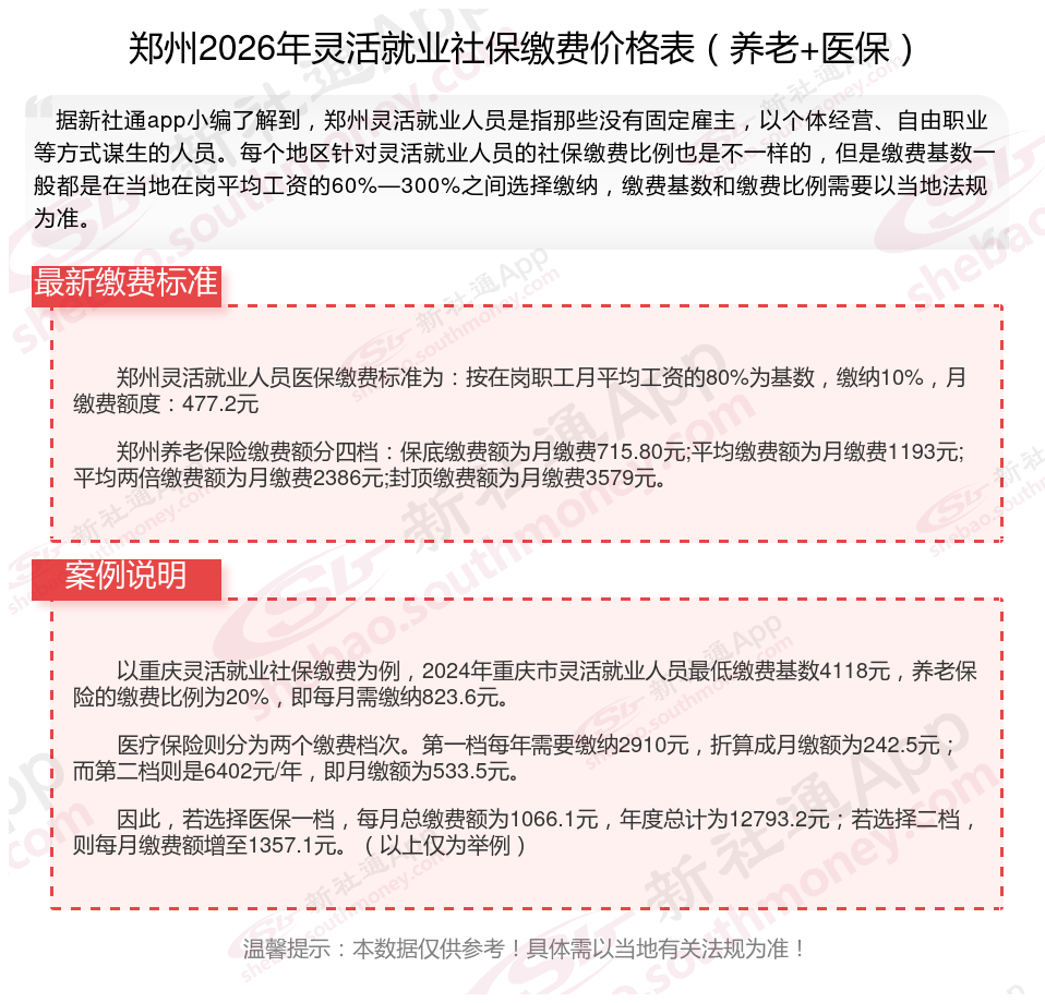 那么,自由职业者社保,要交多少钱一个月?根据新社通app-社保缴费查询工具提供的2026社保缴费标准详情数据: