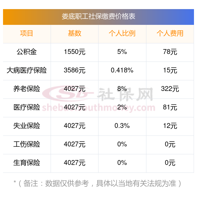 在职人员五险一个月交多少钱 公司加个人是多少?下表是2024-2025年娄底社保费用明细参考,新社通app-社保缴费查询工具提供的最新数据如下: