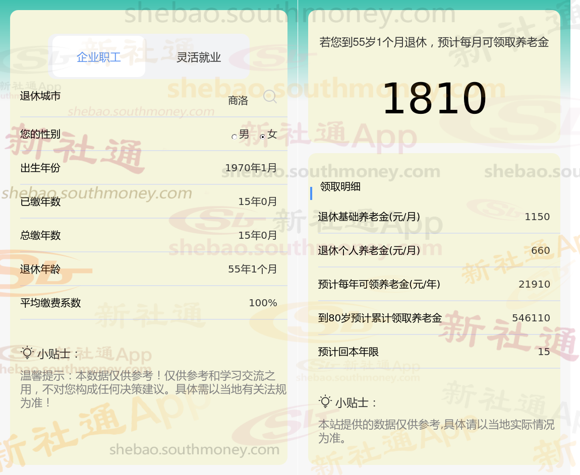 退休城市:商洛,性别:女,出生年份:1970,总缴年数15年,缴费档次:100%,新社通app养老金计算器所得: