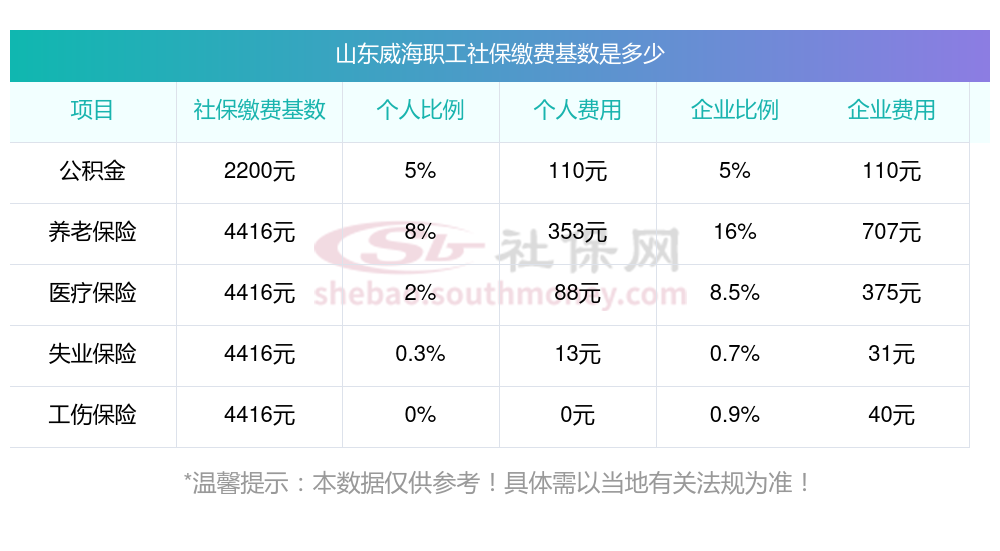 2025年山东威海社保缴费最低基数及个人和单位具体是多少钱?下表是2025年山东威海社保费用明细参考,新社通app-社保缴费查询工具提供的最新数据如下:
