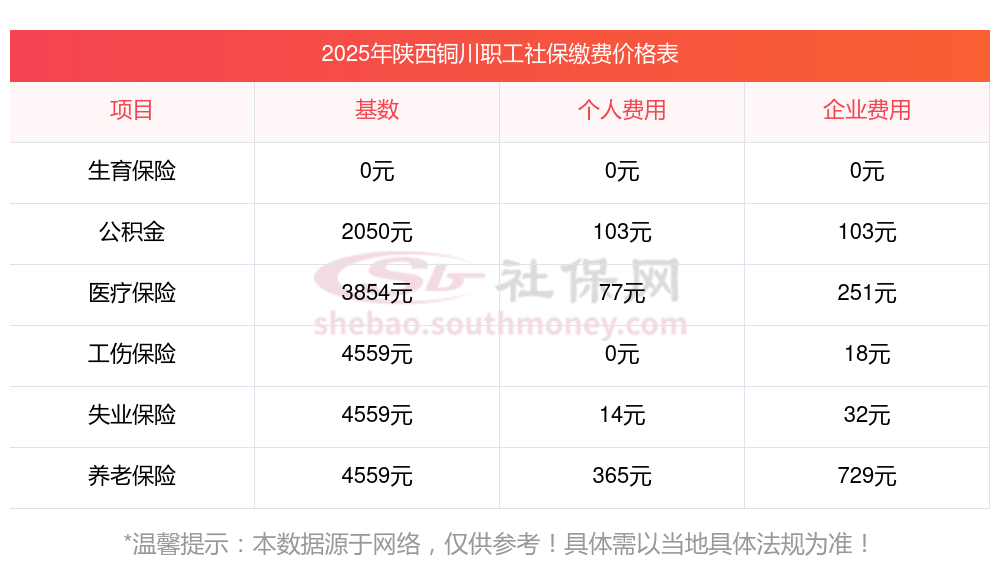 2025年陕西铜川五险缴费标准是多少,2025年陕西铜川社保缴费多少钱?下表是2025年陕西铜川社保费用明细参考,新社通app-社保缴费查询工具提供的最新数据如下: