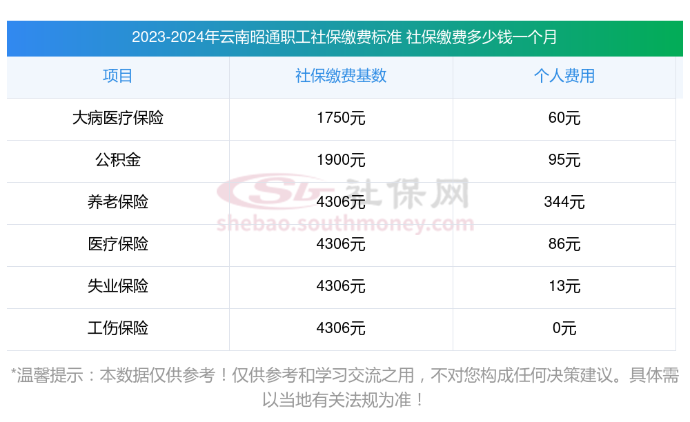 云南社保个人怎么交费?下表是2024-2025年云南昭通社保费用明细参考,新社通app-社保缴费查询工具提供的最新数据如下: