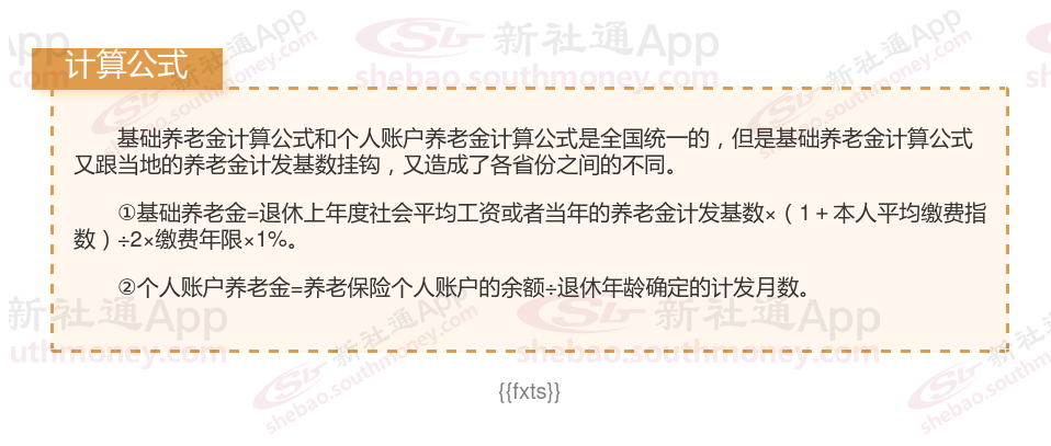 基础养老金:以当地上年度在岗职工月平均工资和本人指数化月平均缴费工资的平均值为基数,缴费每满1年发给1%。计算公式为:基础养老金 = (参保人员退休时全区上年度城镇单位在岗职工月平均工资 + 本人指数化月平均缴费工资)/ 2 × 缴费年限 × 1%。