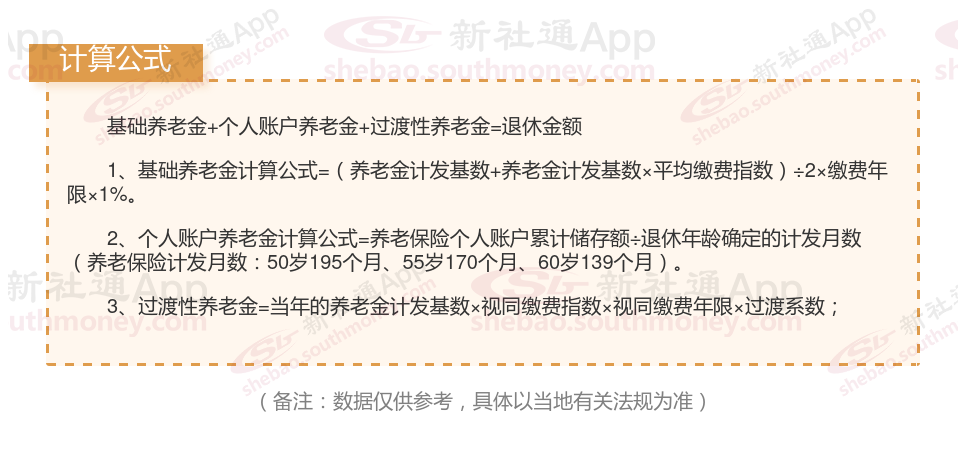 基础养老金计算公式为:(全省上年度在岗职工月平均工资+本人指数化月平均缴费工资)÷2×缴费期限×1%。